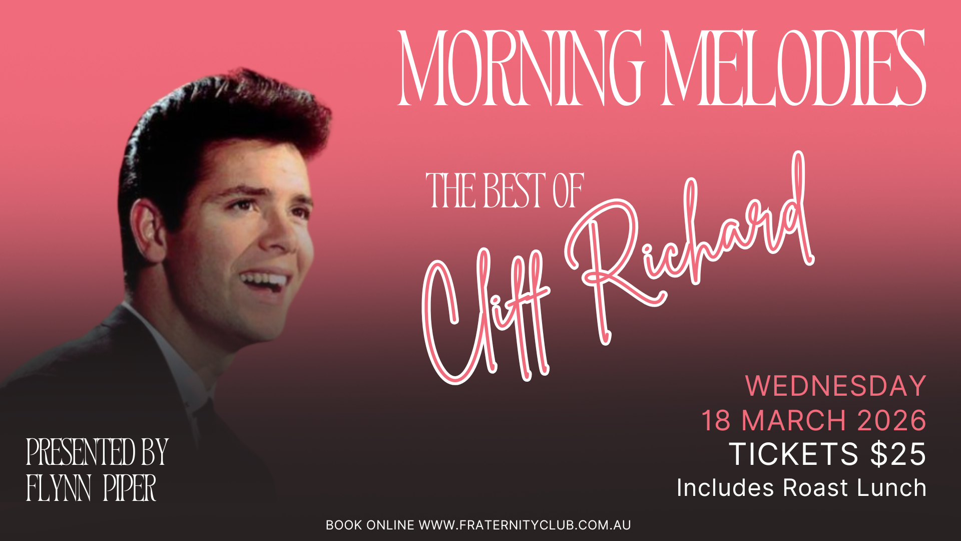 Following a recent sell-out performance of “The Very Best of Cliff Richard & The Shadows 1958–1968”, Flynn thrilled audiences with 15 of Cliff’s No. 1 and Top 10 hits. Expect all the favourites, including Living Doll, Please Don’t Tease, Summer Holiday, The Young Ones, and many more.