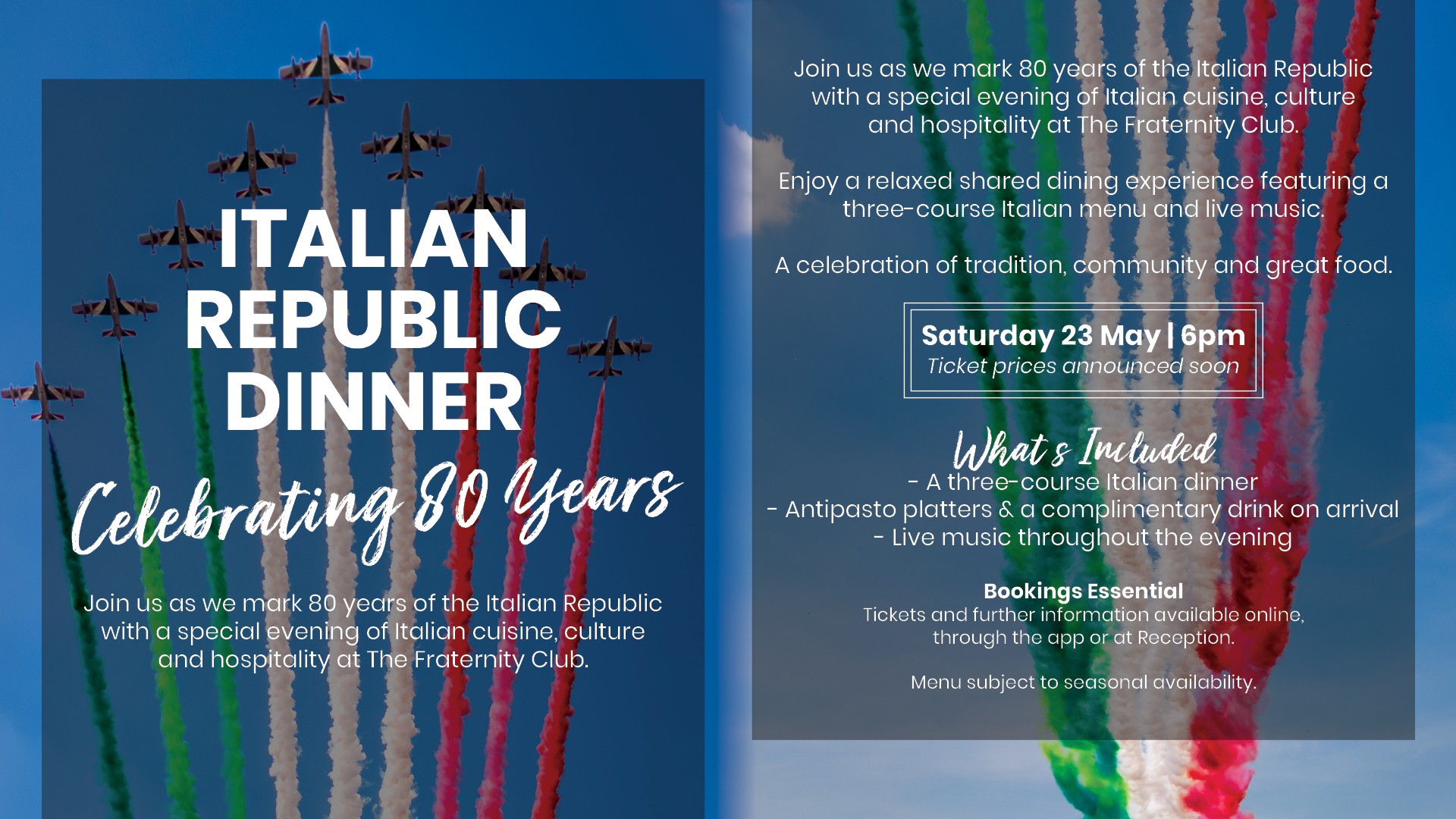 Celebrate 80 years of the Italian Republic at our Repubblica Italiana Dinner — an evening of authentic flavours, shared moments and vibrant Italian hospitality at The Fraternity Club.