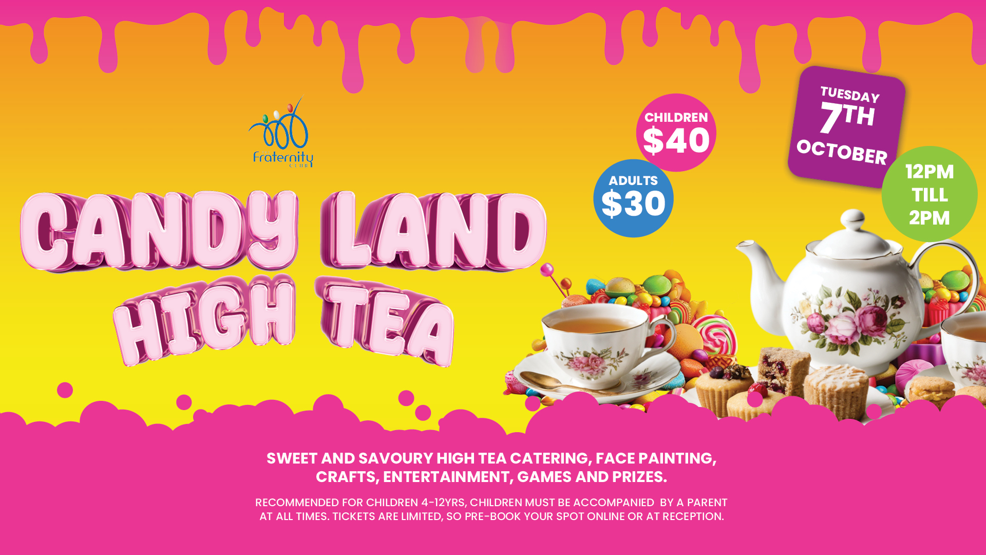 Join us for a magical Candy Land High Tea filled with tasty treats, games, crafts, face painting, and prizes. A delightful celebration for little ones—and plenty of treats for grown-ups too!